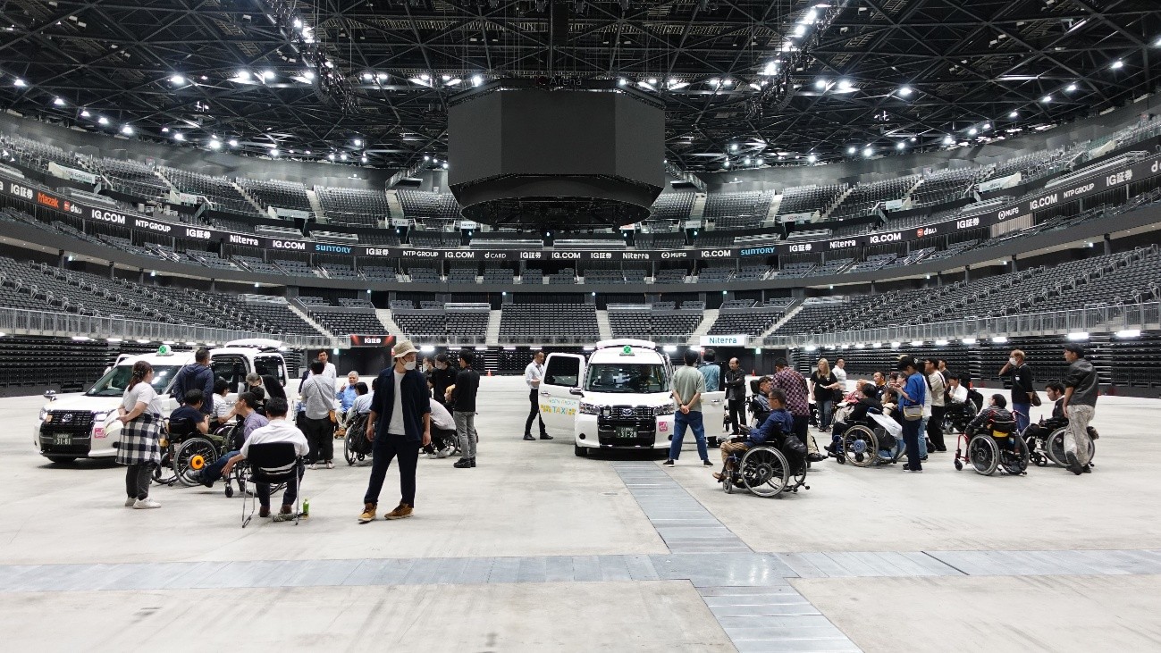 また最後に名古屋タクシー協会 石川優様にご協力をいただき、UDタクシーの乗車体験を行いましたが、雨模様であったためIGアリーナ様のご厚意により、アリーナの中で乗車体験を行わせていただきました。